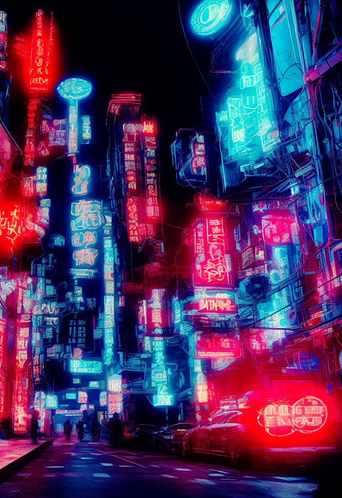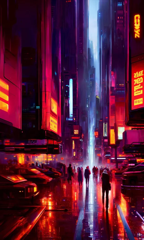 As I walked through the crowded streets, the neon lights of the city seemed to dance and shimmer in the rain. I pulled my coat tight around me, trying to shield myself from the drizzle that was falling from the sky. The pavement was slick and shiny, reflecting the flickering glow of the neon lights as people rushed past me in all directions. The air was thick with the hum of technology, the smell of wet concrete mixes with the scent of fried food from the street vendors.